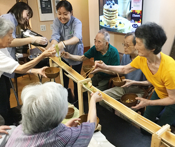 色々な研究の結果から元気で長生きしている方の特徴は「自分の事は自分でする」「人との交流が頻繁にあること」です。自分で料理をつくり、掃除や洗濯して、テレビを見たり、散歩したり、人とお茶をしたり、そういった日常の当たりまえのような生活を送ることが元気の秘訣です。また、施設では10名程度の人数で自宅のような雰囲気で暮らすことが良いという結果も出ています。