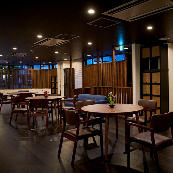 「小伝馬駅」から徒歩2分、「馬喰横山駅」から徒歩4分の建物1階にあります。日が暮れると、京都の「町屋旅館」をコンセプトにした店舗からは、温かみのある光が感じられます。店内は、小さな日本庭園や畳の椅子が置かれ、「和」を基調とした落ち着いた雰囲気が広がっています。フローリング床暖房にも対応しており、一年を通して過ごしやすい店内です。希望制で、夕食の提供、延長サービスの提供も行っています。